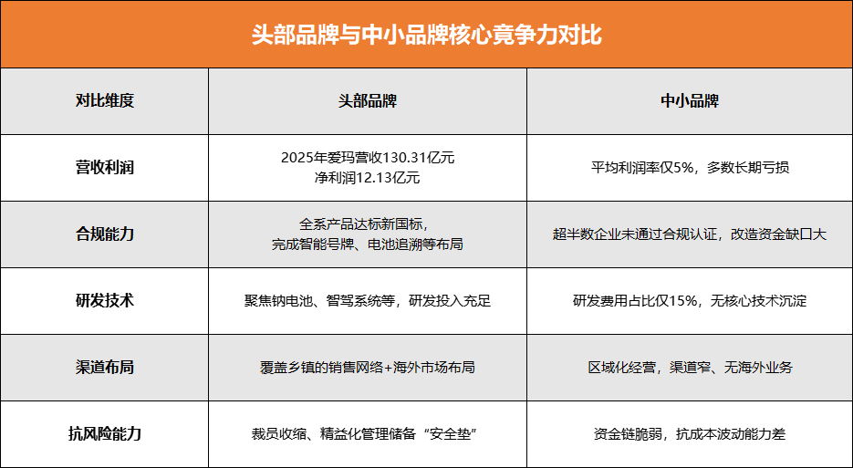 头部品牌已聚焦长续航电池、智能互联系统等高端赛道,台铃的钠电池技术可抵御-30℃低温,九号的智驾系统实现人车云端互联,而中小品牌仍困于基础合规难题,既无资金投入研发,也无规模效应降低成本,在“价格战”失效后彻底失去竞争力。