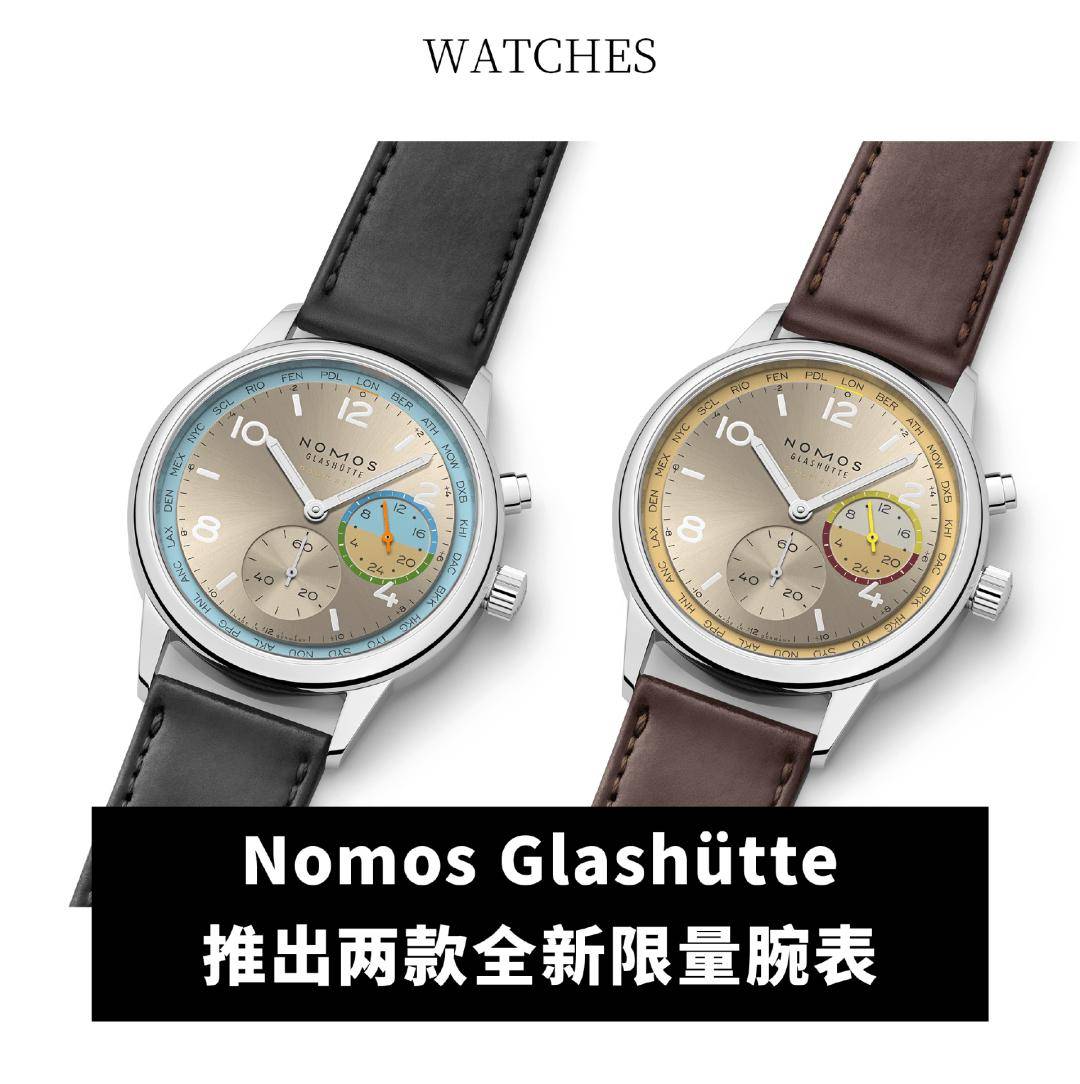 Nomos Glashütte 近日推出两款全新限量 Club Sport Neomatik Weltzeit 运动俱乐部系列创新自动机芯世界时系列腕表——Roam(漫游)和 Reverie(遐想),各限量175支。它们拥有经过太阳纹打磨的香槟色表盘,以及精致的霍文马臀皮表带。